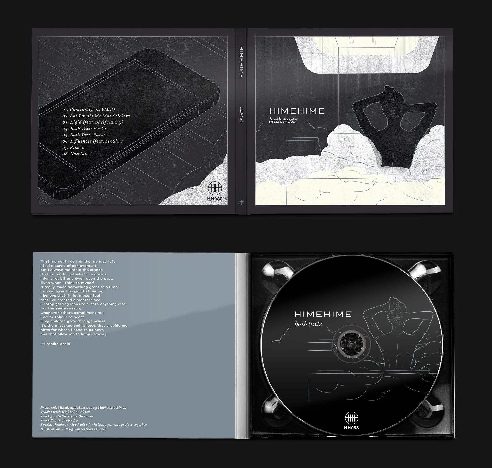 I was commissioned by the electronic music label Hush Hush Records to design the album artwork for the Seattle based artist HimeHime (Mackenzie Simon) for the digital, cassette, and CD release Bath Texts. I was asked to pull inspiration from anime and comics for artwork with a quiet and contemplative look and feel.